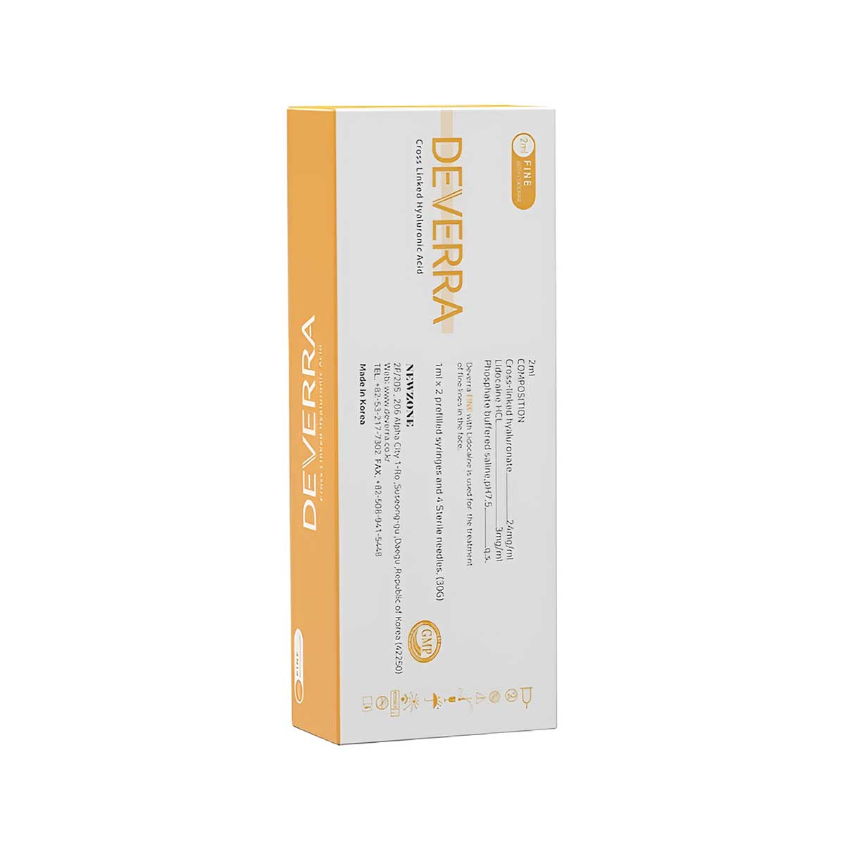 DEVERRA FINE is a lightweight dermal filler formulated with cross-linked hyaluronic acid, ideal for treating fine lines and enhancing skin texture. Each box contains 2 prefilled syringes (1ml each), designed for precise correction in delicate areas of the face.